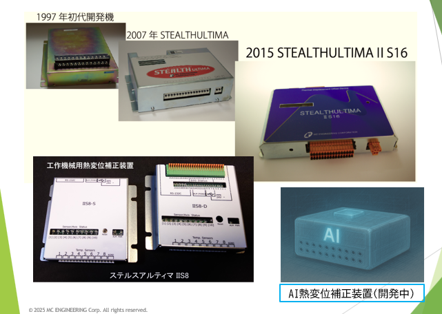 当社は小規模ながらこれまで27年以上にわたり様々なメーカーの多種多様な熱変位を経験・制御してきた実績があり、製品「ステルスアルティマ」シリーズの累計出荷台数も17,000台を超えております。このため、特殊な状況下の機械であっても、個別にカスタマイズした最適な補正をご案内できます。また、現在最新のAI機能付きの製品も開発中です。